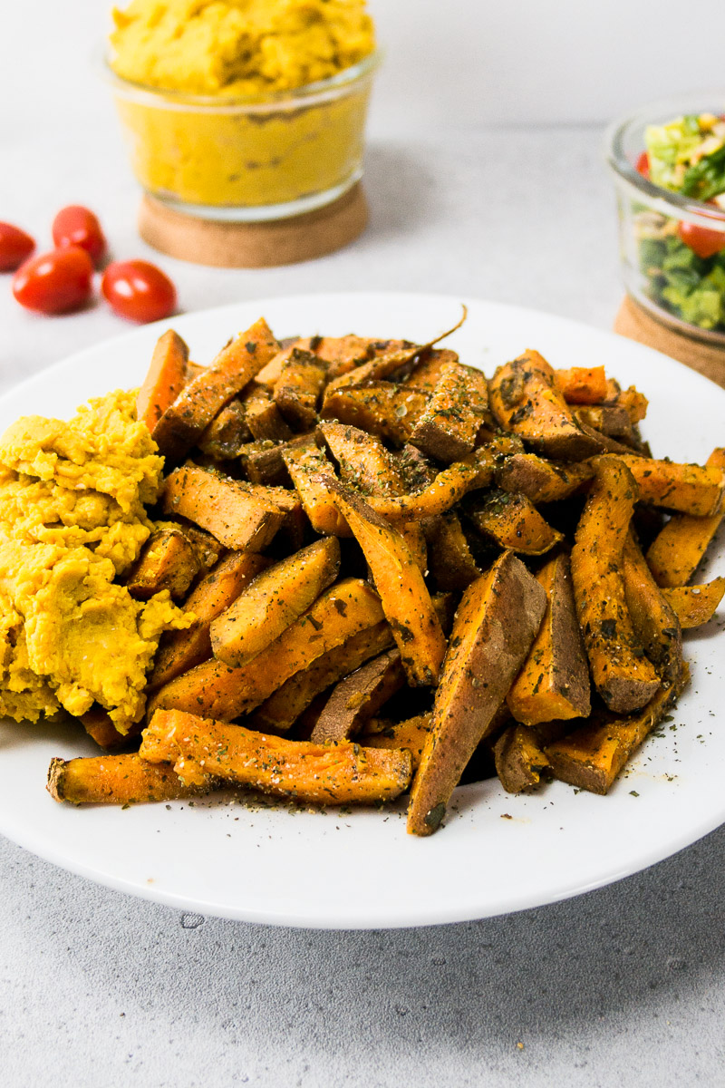 Ricmilkmaid-Blog-Süßkartoffelpommes-Tomatensalat-Kichererbsenpaste-vegan-hoch-4 Süßkartoffelpommes, Kichererbsenpaste, Tomaten, Tomatensalat, Sojasauce, Kokosblütenzucker, orientalisch, mediterran, vegan