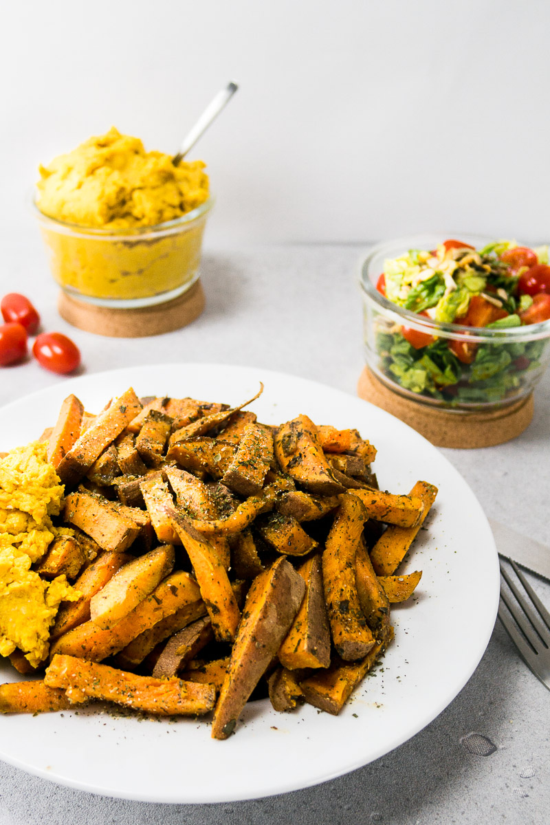 Ricmilkmaid-Blog-Süßkartoffelpommes-Tomatensalat-Kichererbsenpaste-vegan-hoch Süßkartoffelpommes, Kichererbsenpaste, Tomaten, Tomatensalat, Sojasauce, Kokosblütenzucker, orientalisch, mediterran, vegan